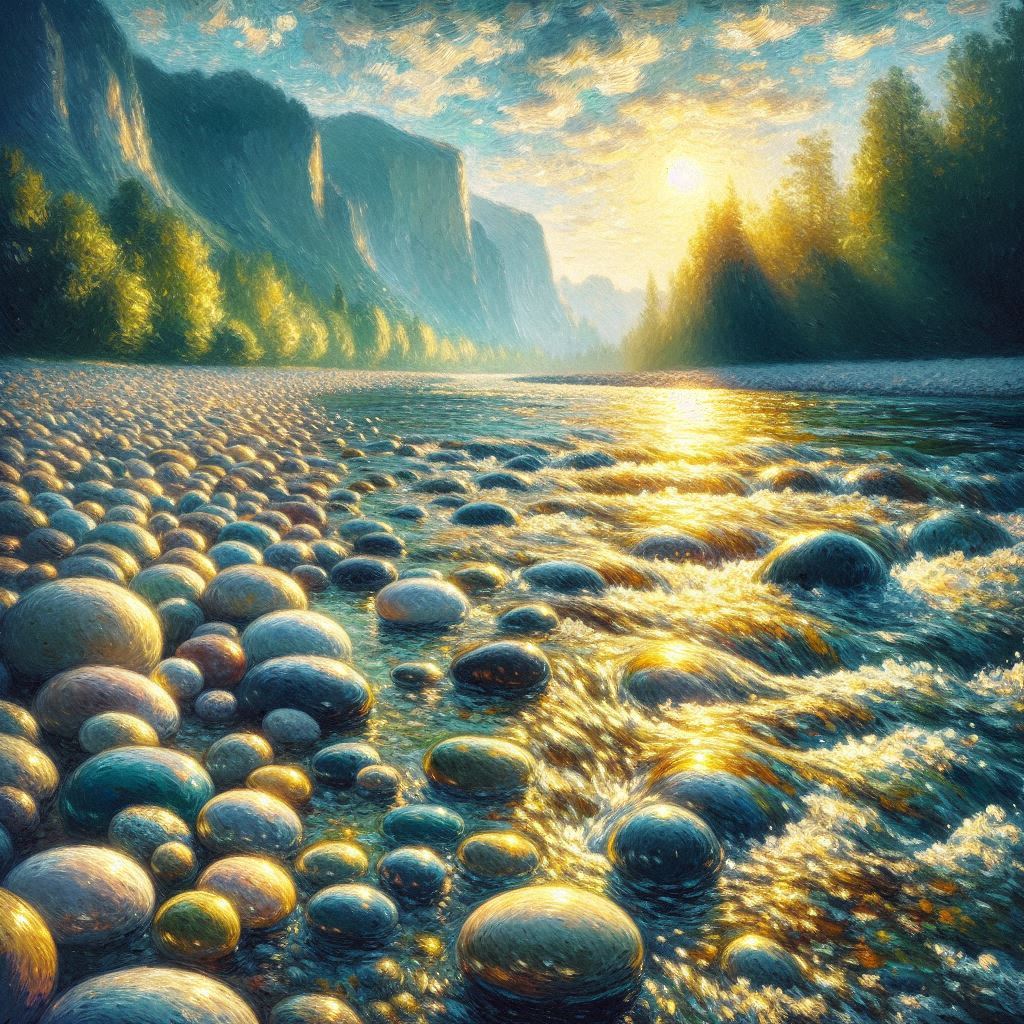 Ich bin ein Kiesel. Ich liege still am Fluss.